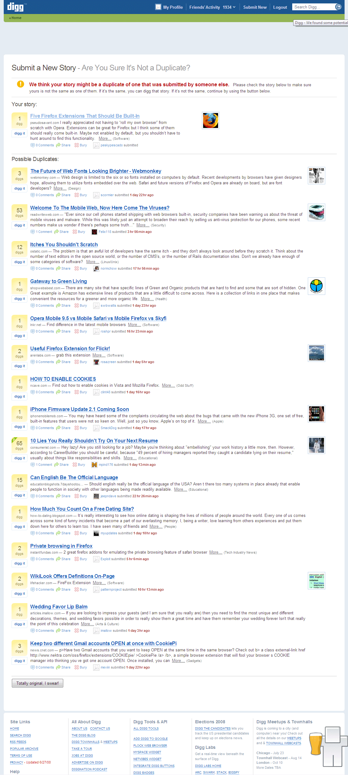 Digg’s Dupe Checker: Totally Original I Swear https://pseudosavant.com/blog/2008/08/11/diggs-dupe-checker-totally-original-i-swear/ https://pseudosavant.com/blog/2008/08/11/diggs-dupe-checker-totally-original-i-swear/#comments Mon, 11 Aug 2008 15:00:33 +0000 http://pseudosavant.com/blog/?p=278 Digg-GuyCould Digg’s duplicate checker be any worse? It constantly asks me if my original posts are duplicates. When I submitted my post about “Five Firefox Extensions That Should Be Built-In” here are the “possible duplicates” Digg found. Tell me how close you think these submissions are to mine.